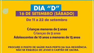 Sábado, dia 16 de setembro, será realizado o Dia D da Campanha Nacional de Multivacinação, do Ministério da Saúde. Neste dia, os postos de saúde estarão abertos em todo o país para receber cerca de 47 milhões de crianças e adolescentes menores de 15 anos, convocados para serem imunizados.